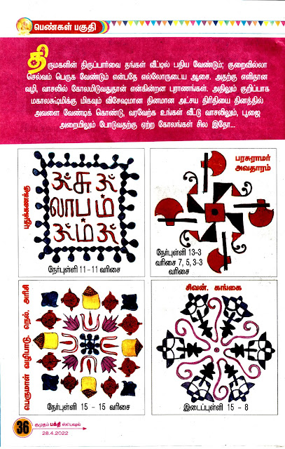 இந்தக் கோலங்கள் 28.4.2022 குமுதம் பக்தி ஸ்பெஷலில் வெளியானவை.